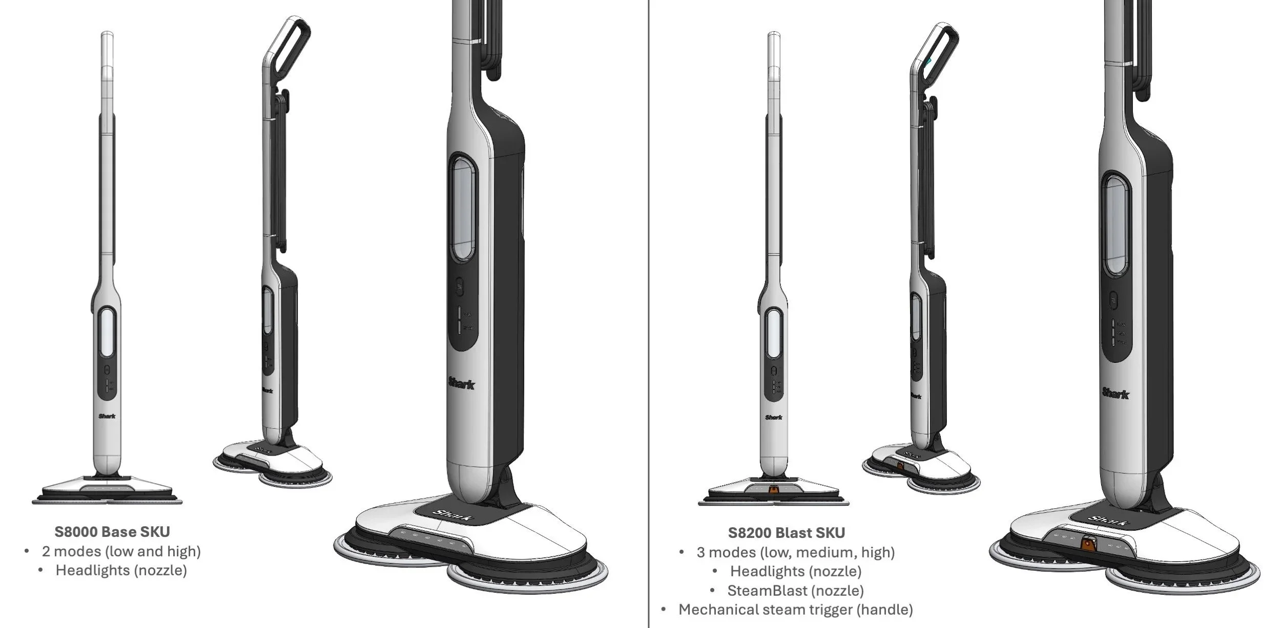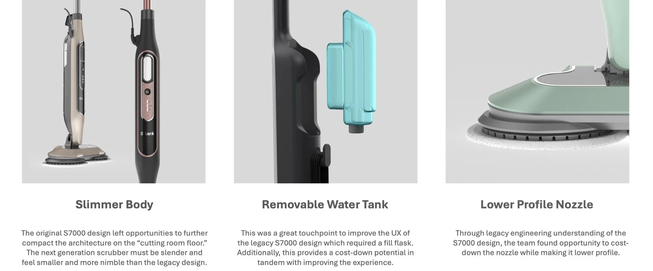 Shark launched its first steam scrubber in 2021 and the “Steam Blast” sku extension in 2023. Shark’s dominance in the category has gained steam over the years and the Steam Scrubber design was due for a refresh. The new design would need to be elevated and improve both product perception and user experience, but also capitalize on cost-saving opportunities.